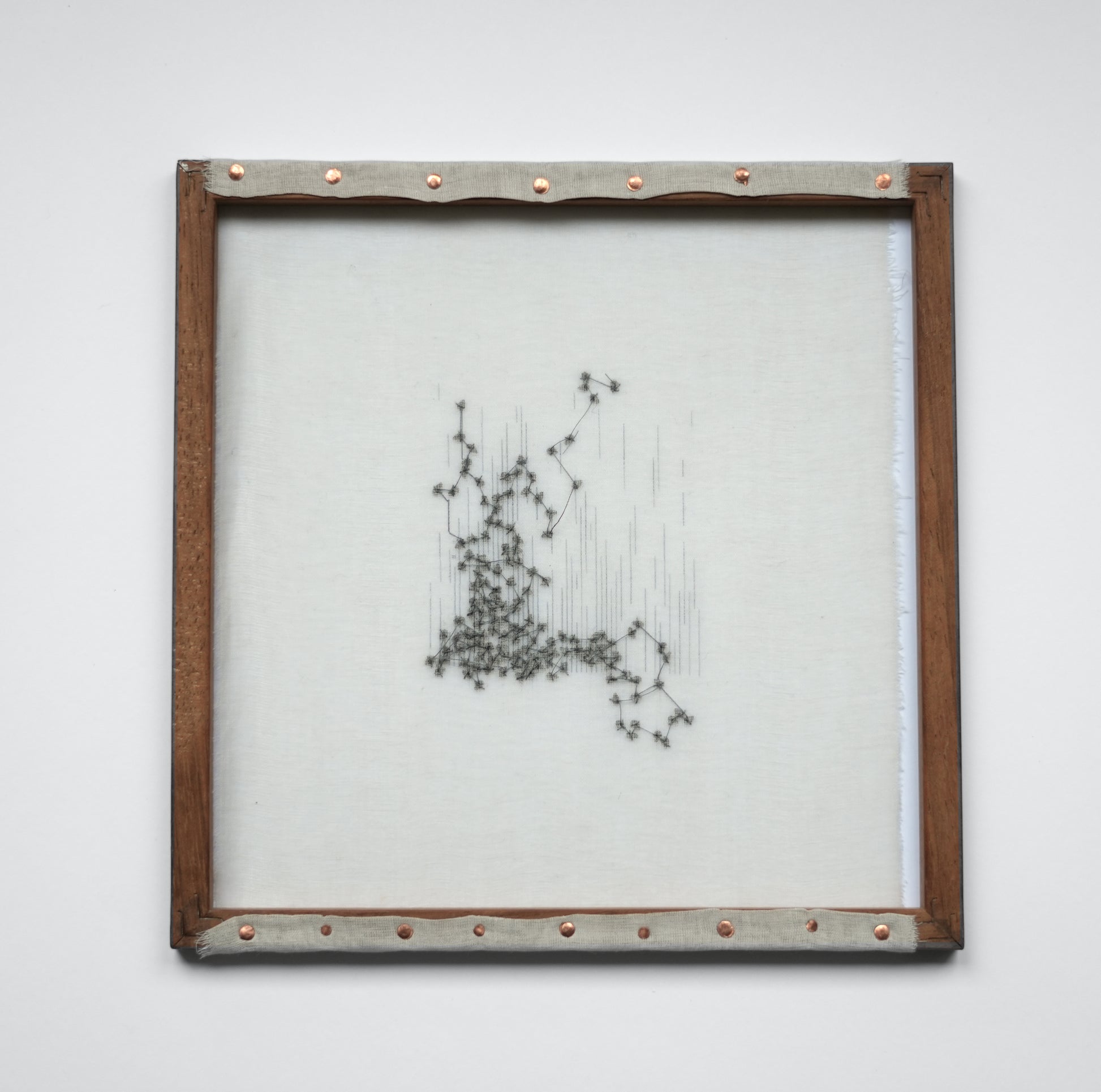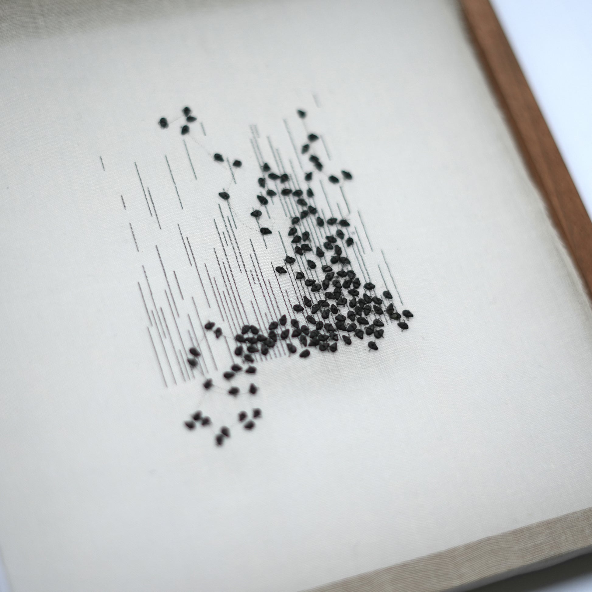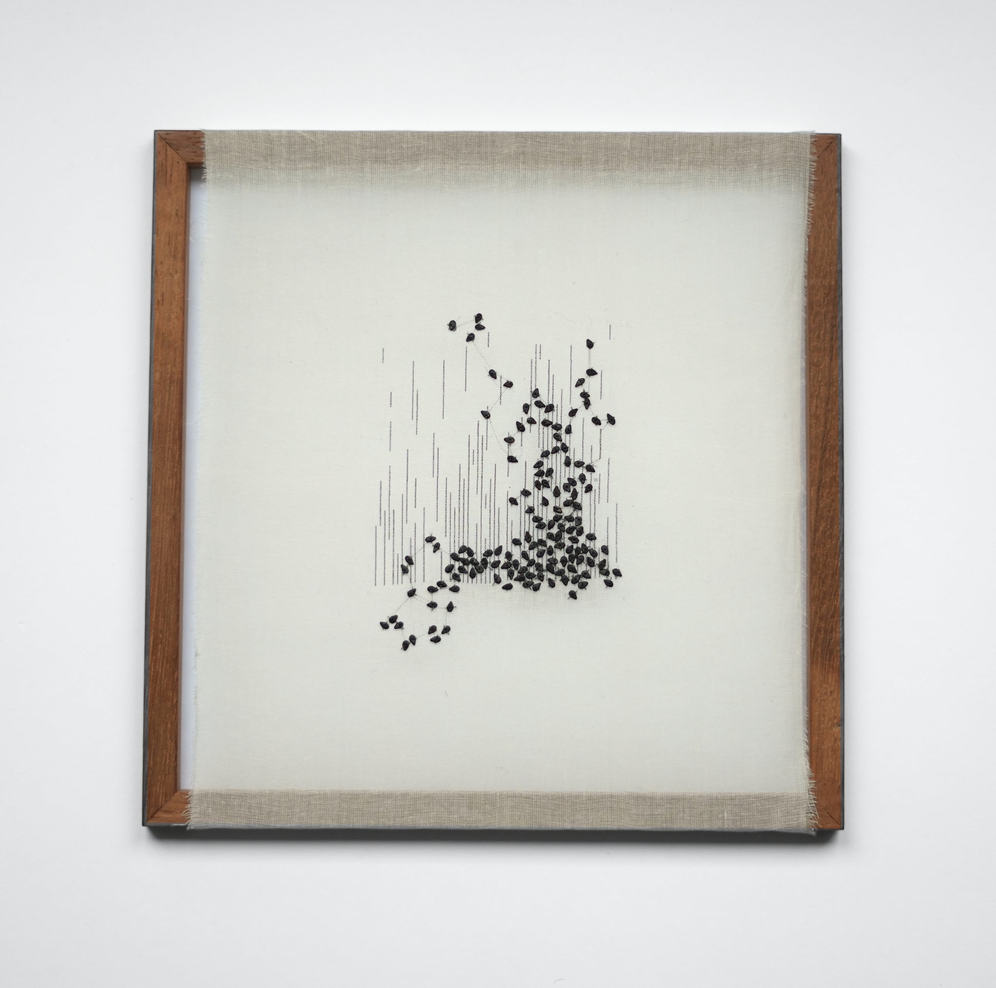 Small study combining typewriter on fine cotton and individually stitched sesame seeds.
