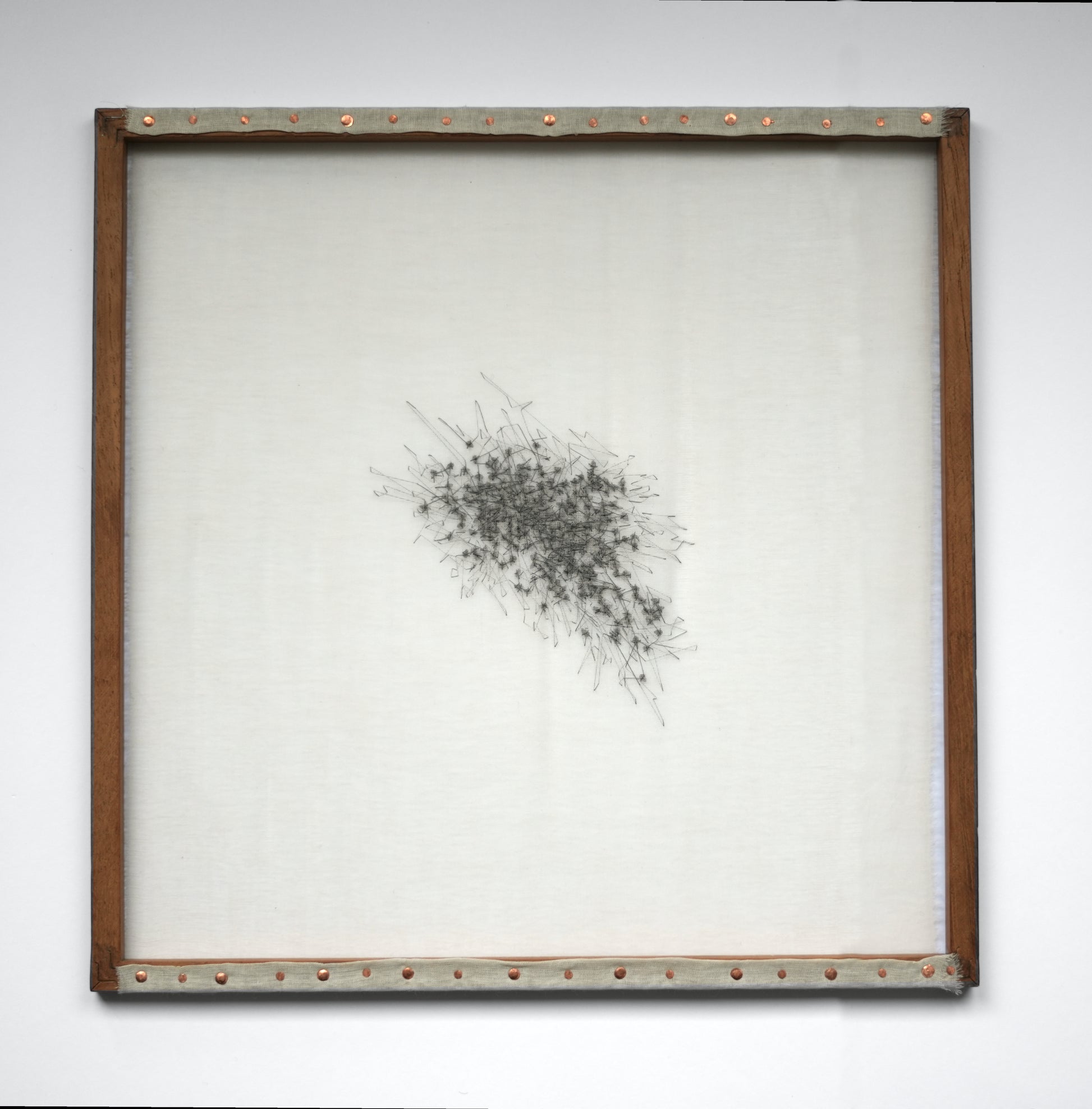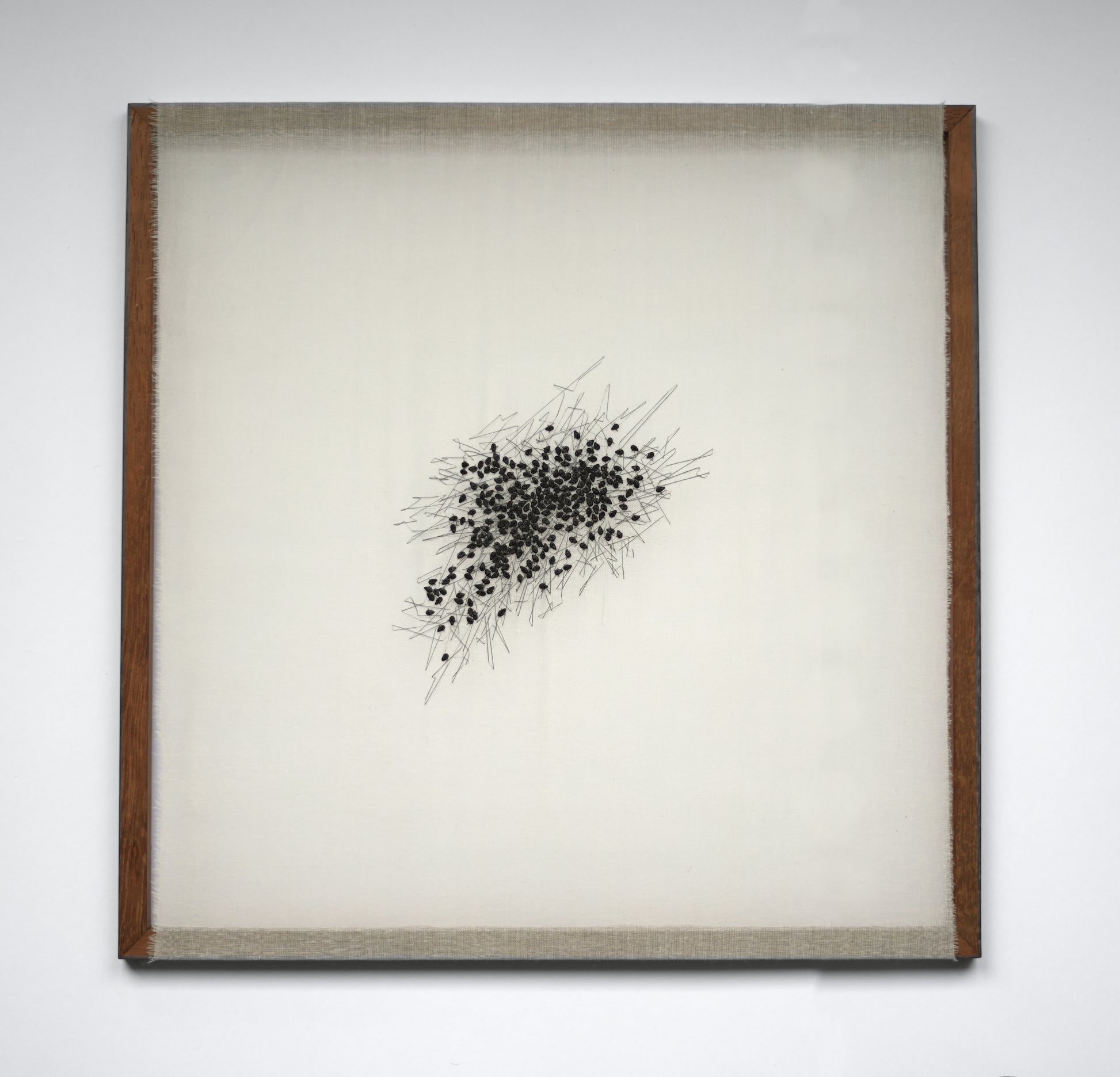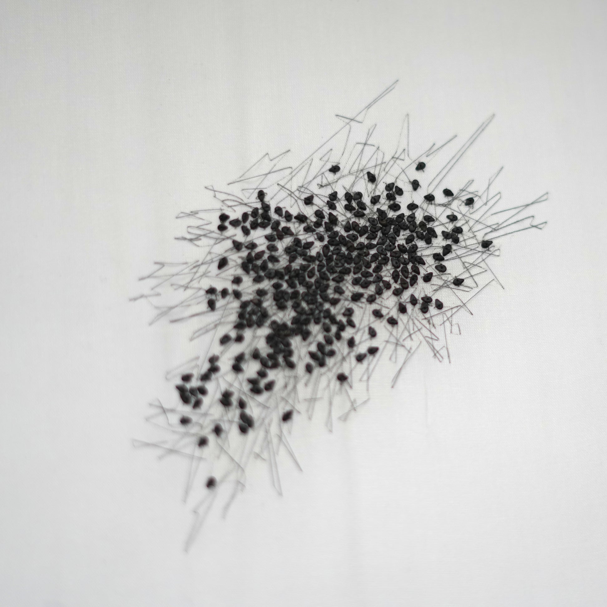 Black sesame seeds individually stitched onto fine cotton